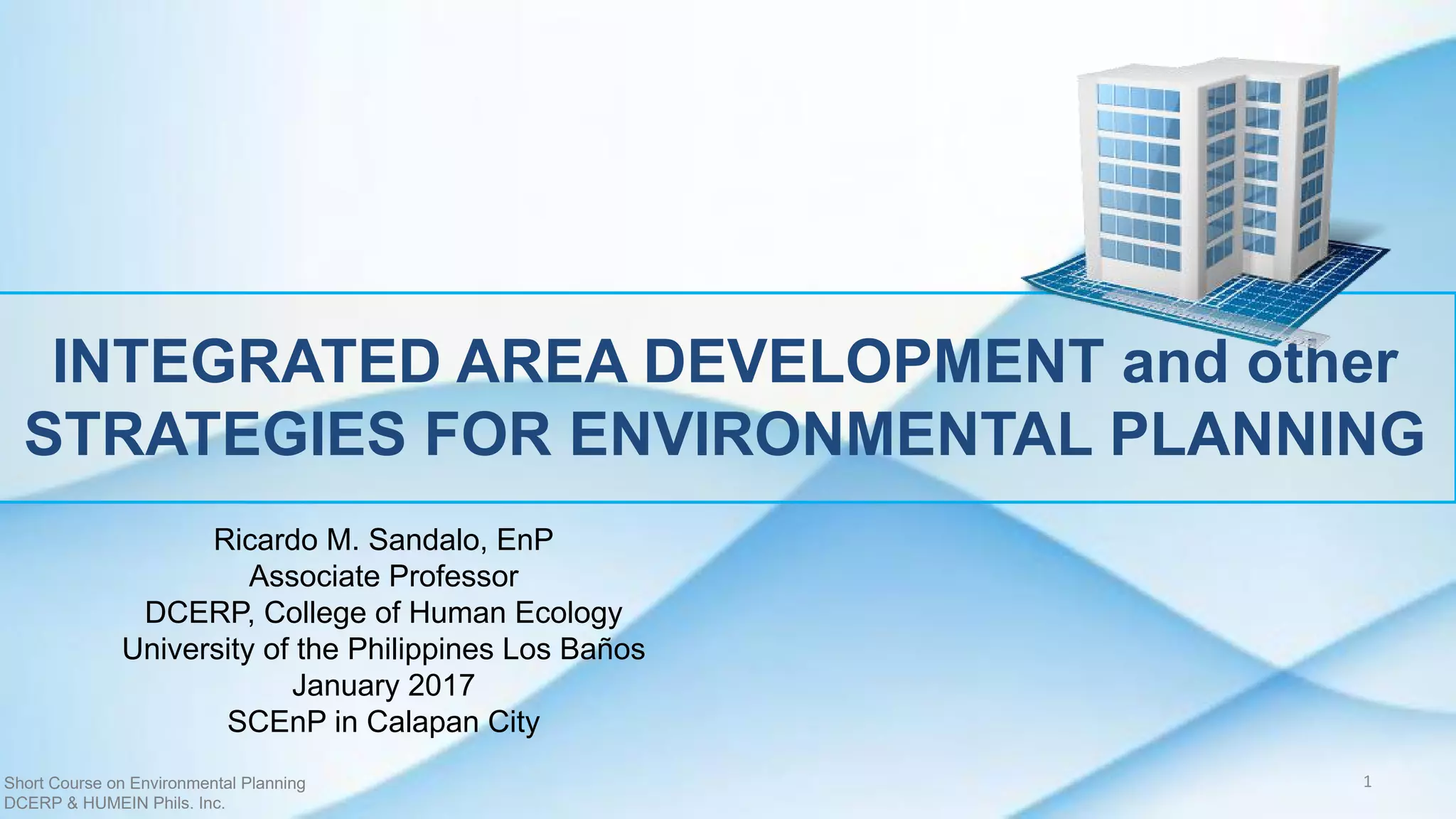 The document discusses integrated area development (IAD) as an environmental planning strategy used in the Philippines from the 1970s to 1986. IAD projects aimed to revitalize economically depressed areas through an integrated approach providing infrastructure and services. Major IAD projects included those in Bicol, Mindoro, Cagayan, Samar, Palawan, and Bohol. IAD distinguished itself from prior rural development through its defined geographic scope, multi-sectoral coordination, and focus on linking rural and urban areas to boost development. However, challenges included difficulties integrating diverse agency plans and gaining grassroots participation.