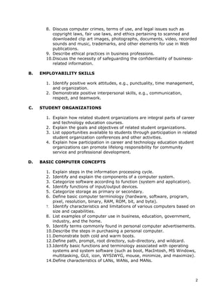 This document outlines an integrated business applications course that teaches Microsoft Office skills to obtain MOS and MCAS certifications. The course covers word processing, spreadsheets, databases, presentations and other topics like safety, ethics, employability skills and basic computer concepts. Students completing the coursework will be prepared to test for expert level certification in Microsoft Word and Excel or certification in Microsoft Office 2007 applications. The course is 1 credit, recommended for grades 9-12, and requires keyboarding proficiency and one computer per student.