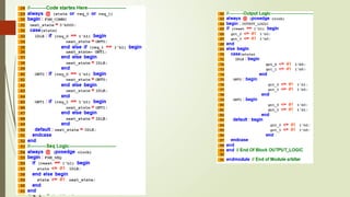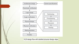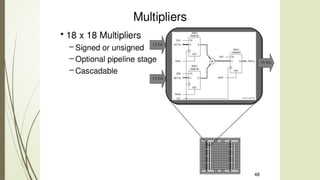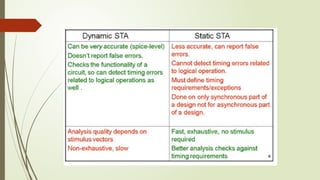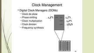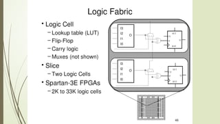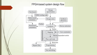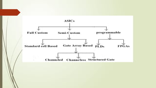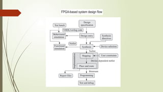The document provides an overview of ASICs and FPGAs, detailing their types, design flows, and architectures. It discusses various programming technologies for FPGAs, such as antifuse, EPROM, and SRAM-based options, alongside the essential components like logic blocks and switch matrices. Additionally, it covers timing analysis, synchronous digital circuits, and relevant design considerations in FPGA implementation.