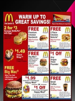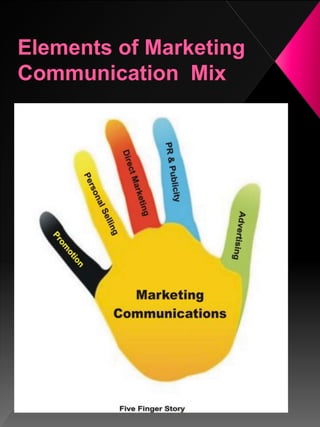 The document discusses marketing communications mix, which refers to the variety of strategies used to advertise and promote a business or product line. It focuses on the five main aspects: sales promotions, personal selling, direct marketing, general advertising, and public relations. Together these make up an organization's promotional mix to alert consumers to product benefits and availability. The goal is to effectively communicate with customers through an integrated approach.