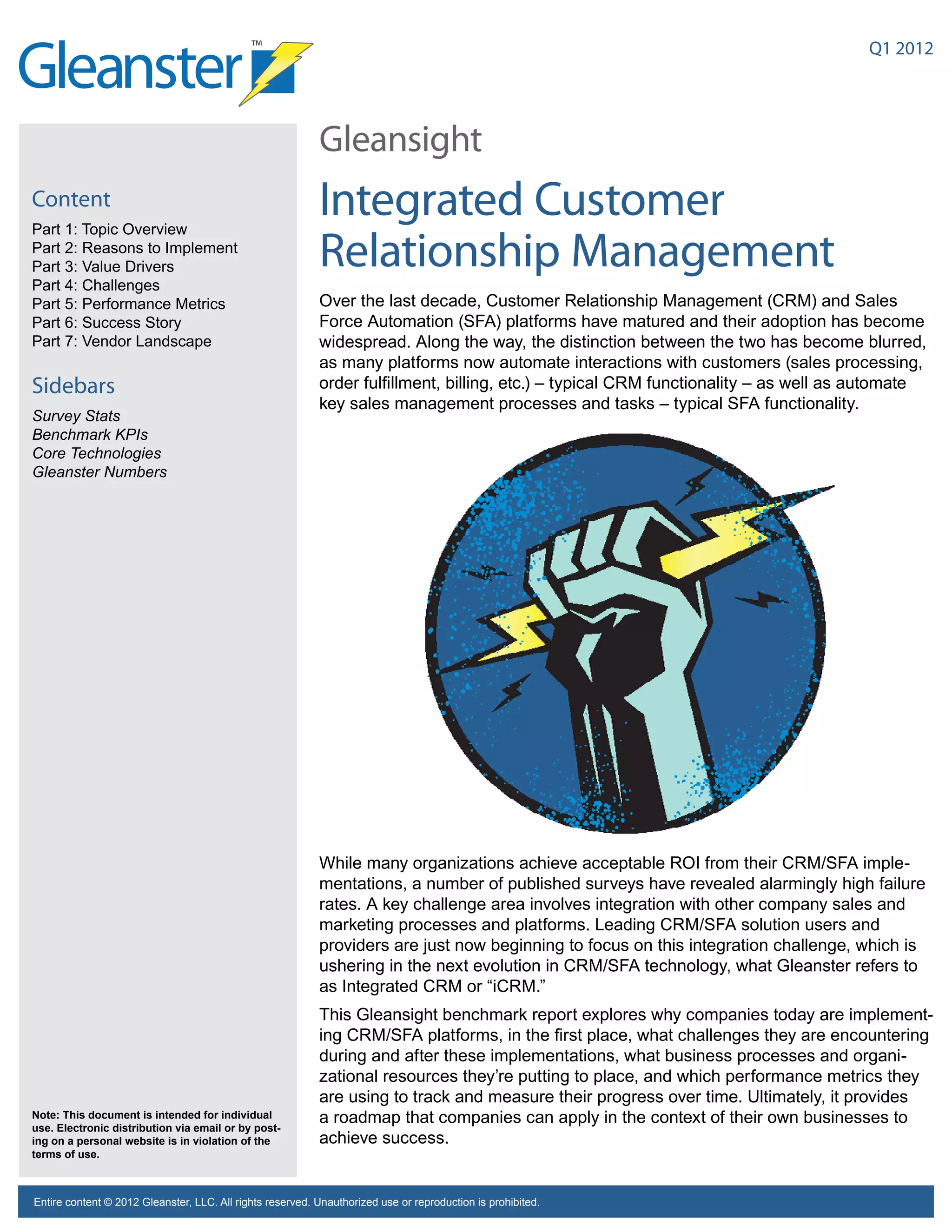 This document provides an overview of integrated customer relationship management (iCRM). It discusses the evolution of CRM/SFA platforms and their widespread adoption. While many organizations see ROI from CRM implementations, failure rates remain high due to lack of integration with other systems. Leading users are focusing on this integration challenge, which is driving the next evolution in CRM technology. The document outlines reasons for implementing CRM, key value drivers focused on by companies, challenges faced, and metrics for measuring success. Ultimately, it provides a roadmap for achieving success with iCRM.
