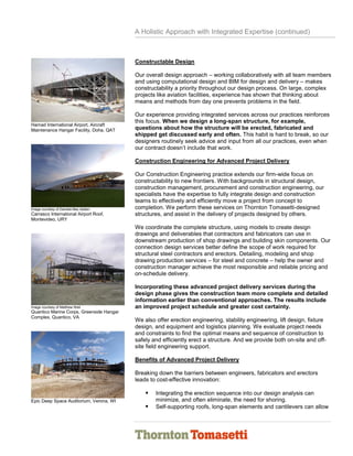Thornton Tomasetti provides holistic engineering design services through 10 integrated practices including structural engineering, sustainability, renewal, facade engineering, forensics, and construction engineering. They take a collaborative approach to projects from concept through completion. Their expertise in multiple disciplines allows them to understand projects from various perspectives for better outcomes.