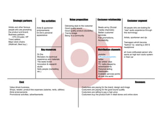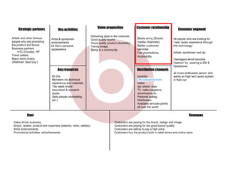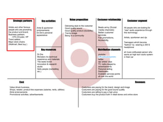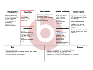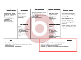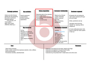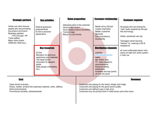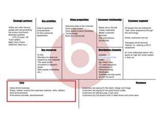 Beats headphones focus on style, sound quality, and trendiness to appeal to DJs, trend-aware people, and fans of partner artists. They build brand loyalty through social media communities and promotions while selling through distributors, stores, and websites. Key resources include Dr. Dre's influence, Monster's technical skills, and partnerships with stores, artists, and companies like HTC and Chrysler that help spread awareness of the Beats brand.
