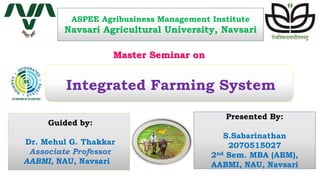 This document provides an overview of a Master Seminar on Integrated Farming Systems presented by S. Sabarinathan. It discusses the current challenges facing agriculture like increasing population and food demand, soil degradation, and climate change. Integrated Farming Systems is presented as a solution to issues like declining agricultural growth and productivity. IFS aims to diversify production, increase income, improve nutrition, and conserve resources. The document outlines the components, objectives, and benefits of IFS, as well as factors that determine the appropriate systems. It provides examples of IFS models and concludes by emphasizing the role IFS can play in sustainable development.