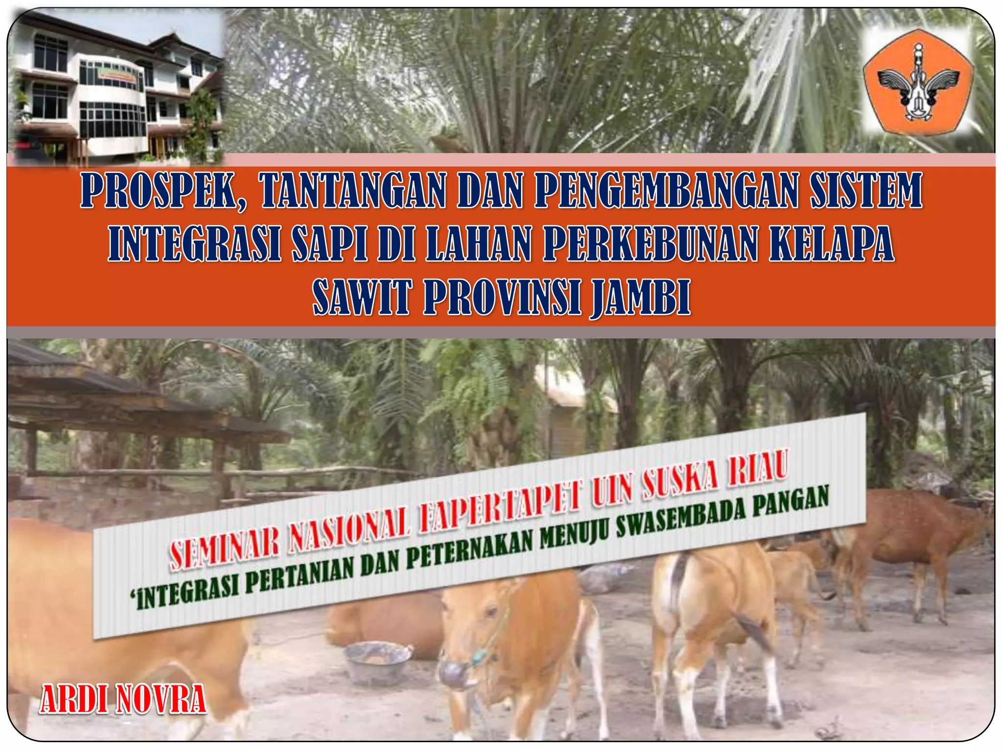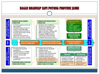 Dokumen ini membahas strategi pengembangan integrasi antara peternakan sapi potong dan perkebunan sawit di Provinsi Jambi untuk mencapai swasembada daging sapi dan peningkatan produksi hingga surplus pada tahun 2015. Ditekankan pentingnya sinergi antara pemangku kepentingan, manajemen limbah, dan pemeliharaan yang berkelanjutan untuk memaksimalkan keuntungan dan mengurangi dampak negatif terhadap lingkungan. Kesimpulannya, investasi dalam usaha fattening memiliki prospek lebih tinggi tetapi pengembangan breeding juga penting untuk memperluas jangkauan mitra binaan.