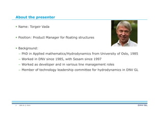 1) An overview of Sesam and its capabilities for hydrostatic, hydrodynamic, and structural analysis of floating structures.