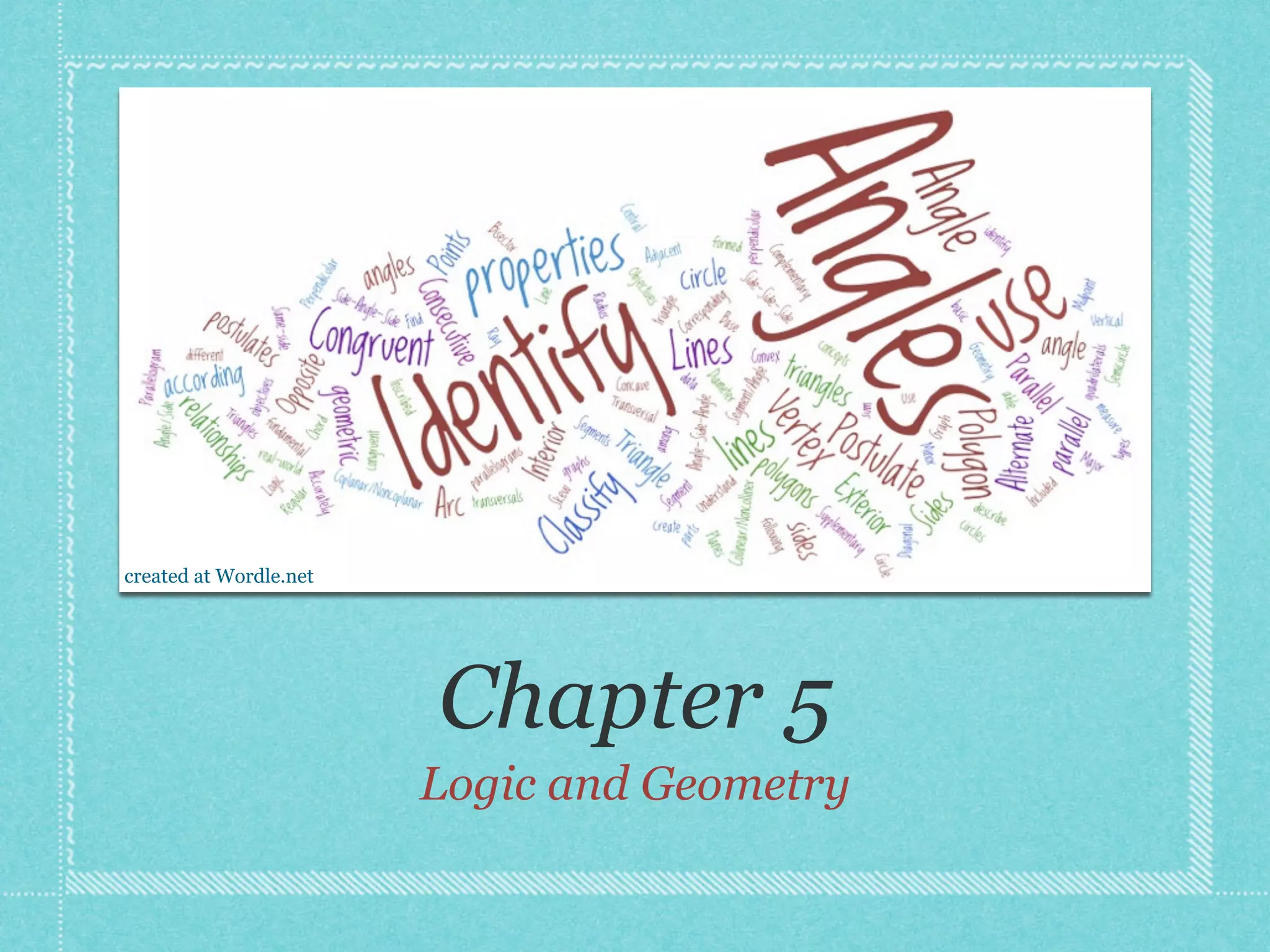 This document provides an overview of fundamental geometric concepts. It begins by defining geometry as the study of points and collections of points in space. Key terms are introduced such as point, line, plane, and space. Properties of these concepts like collinear points, coplanar points, and intersections are explained. Examples are provided to demonstrate classifying types of points and intersections. The document concludes by presenting postulates about points, lines, and planes that are assumed to be true in geometry. For homework, problems 1-29 on page 194 are assigned.