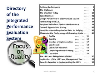 This document proposes an integrated performance evaluation system for government agencies in the Philippines. It aims to move beyond just measuring output to also assess quality, schedule, use of funds, and staff productivity. It establishes criteria in these five areas to evaluate operating units. Data like annual plans, progress reports, fund reports, and absence reports would provide inputs. Performance would be measured by deducting points based on the degree of deviation from standards. This aims to make evaluations more objective and reduce subjectivity. The system seeks to promote a culture of teamwork, efficiency and organizational goals over self-interest.