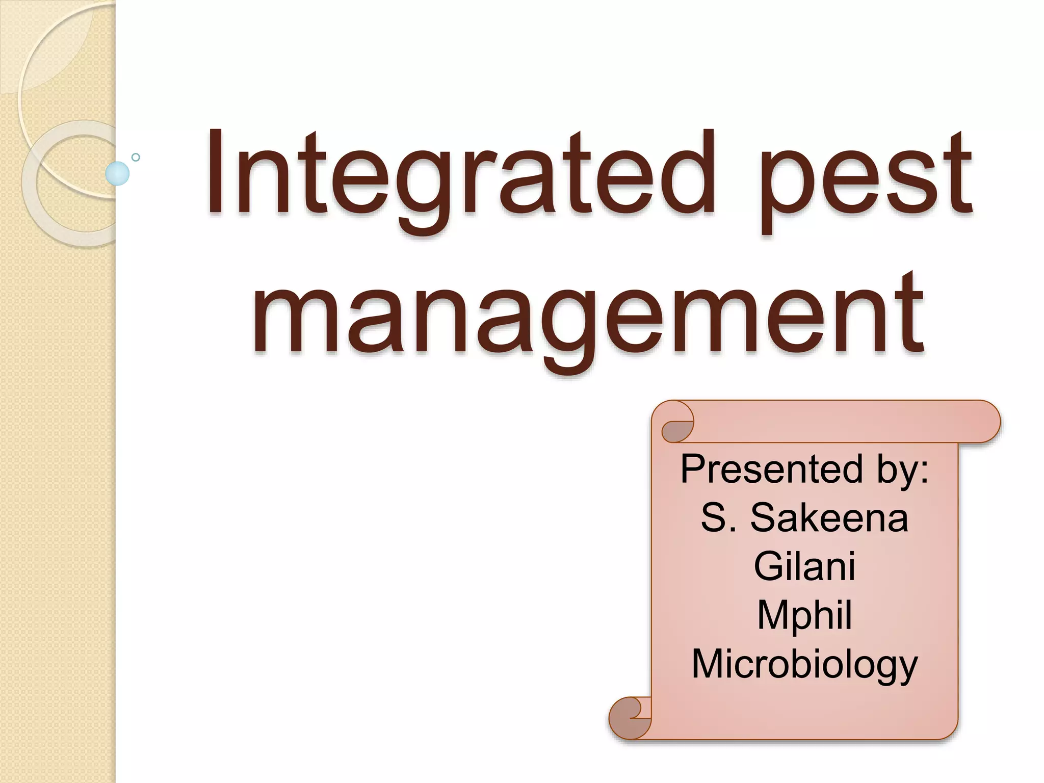 The document discusses integrated pest management (IPM) for food processing facilities. IPM aims to control pests through prevention and elimination of conditions that support pest populations. It emphasizes regular inspection, identifying entry points and food/water sources, and addressing issues before using chemicals. The key steps of IPM include inspection, preventative planning, identification of pest issues, analyzing the causes, selecting targeted treatments, ongoing monitoring, and documentation. IPM provides long-term pest control through non-chemical methods and minimizing application of pesticides.