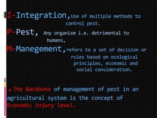 Integrated Pest Management (IPM) uses multiple methods to control pests in an agricultural system. The backbone of IPM is the economic injury level concept. Reasons for adopting IPM include the development of pest resistance, secondary pest outbreaks from overuse of pesticides, and environmental and human health hazards from chemical contamination. IPM involves understanding the agricultural ecosystem, planning for low-cost and environmentally friendly pest control, and using a variety of control methods like cultural practices, host plant resistance, biological and chemical methods to maintain pest populations below economic thresholds. The objective of IPM is to reduce pest damage in a sustainable way without complete elimination of pests.