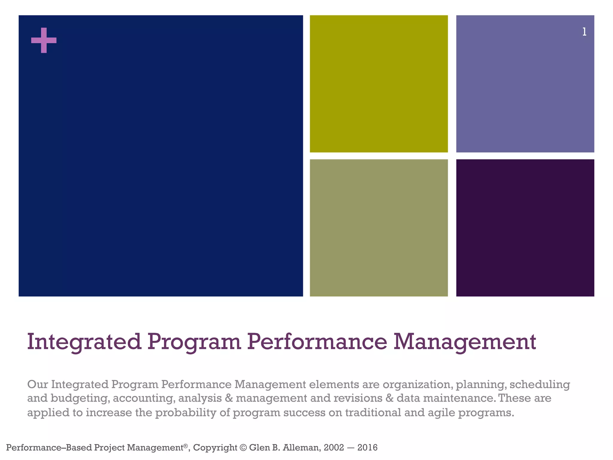The document discusses integrated program performance management elements, focusing on organization, planning, scheduling, budgeting, accounting, and risk management to enhance program success in both traditional and agile environments. It outlines the motivation behind integrated solutions for increasing revenue, customer base, and market credibility, while detailing the required tools and processes for effective management and execution. Additionally, it emphasizes the importance of performance measurement and risk management as critical success factors for winning proposals and project execution.