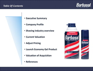 This document provides an overview of acquiring the Barbasol brand from its parent company Perio Inc. Key points include: