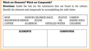 answer the questions. List down in Table below the compounds in the product label and the constituent elements. There are cases that you will need to look up the constituent