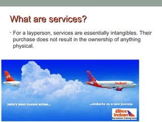 The document introduces the services marketing triangle, which consists of internal marketing, interactive marketing, and external marketing. Internal marketing involves training and communication with employees to enable them to deliver the promised service. Interactive marketing refers to the direct interaction between employees and customers. External marketing is aimed at end-users, and involves pricing, promotion, and communication to attract customers and set expectations. The triangle framework can be used to assess a service organization's performance across these three areas and identify strengths and weaknesses.