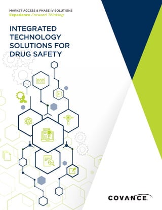 This document discusses how integrated technology solutions enhance drug safety by leveraging proactive insights and process excellence, fundamentally transforming safety operations within the healthcare continuum. Covance offers various patient safety services and technology platforms aimed at optimizing pharmacovigilance processes, ensuring compliance, and driving operational efficiencies. By adopting a full life cycle approach to safety technology and data analytics, Covance helps life science companies effectively manage risks and improve productivity while minimizing costs.