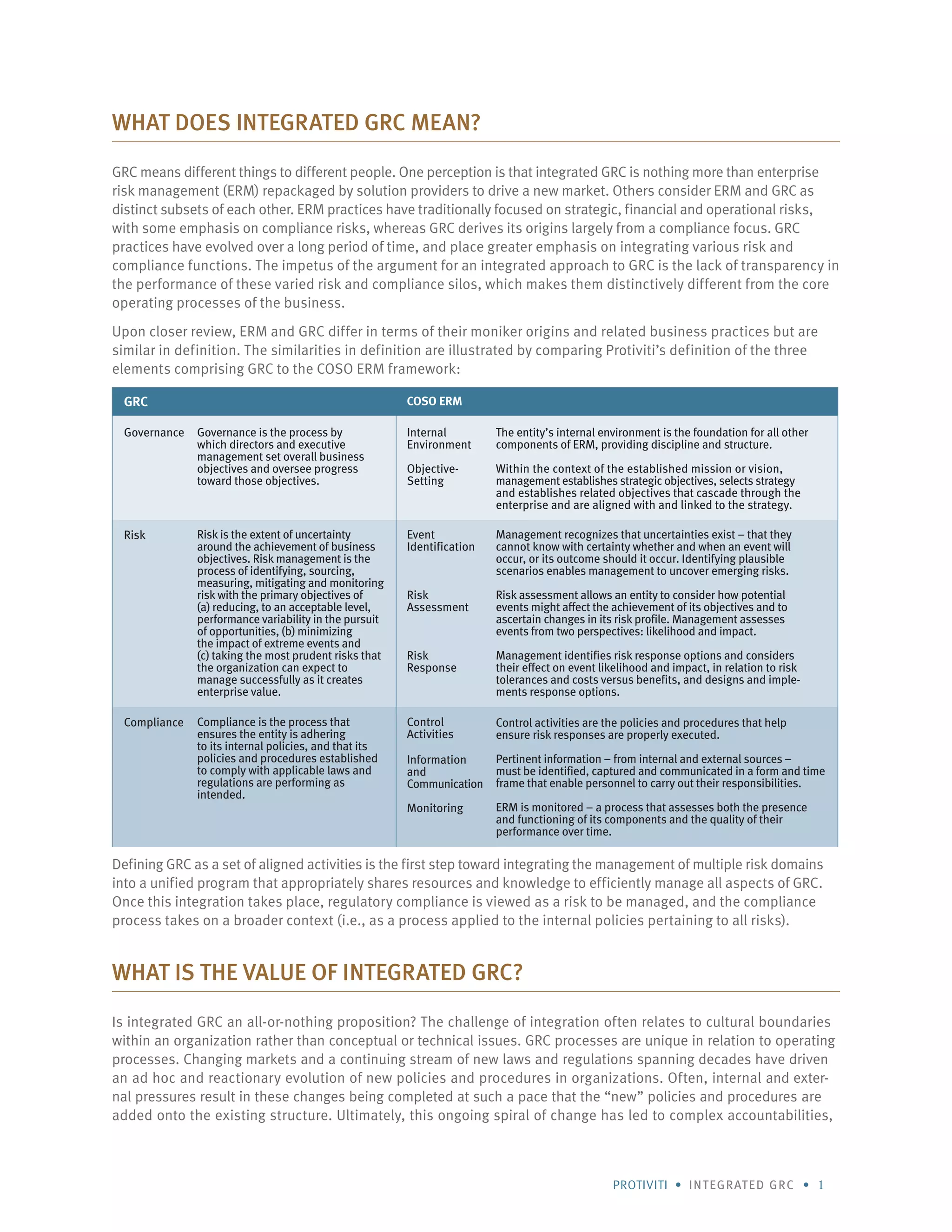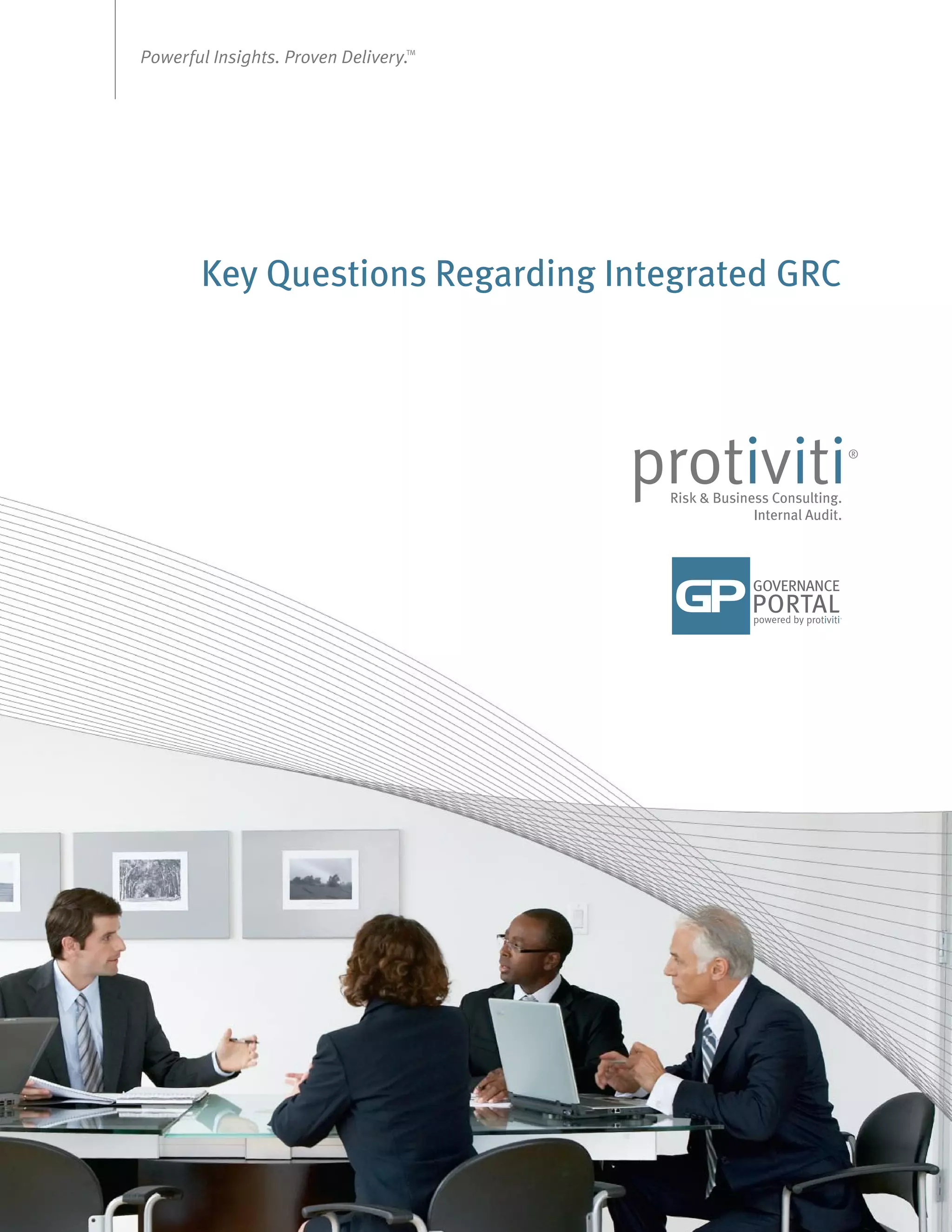 The document discusses key questions regarding integrated governance, risk management, and compliance (GRC). It begins by explaining that GRC means different things and considers the value of an integrated approach. An integrated GRC program can provide improved transparency, efficiency, and decision-making. However, there are also barriers like high costs and lack of a common framework. The document provides practical steps for organizations to achieve an integrated GRC approach, including building a business case, establishing a GRC committee, developing a unified risk framework, and establishing centralized oversight and reporting. The goal is to continuously improve GRC integration over time to optimize processes and better manage risks.