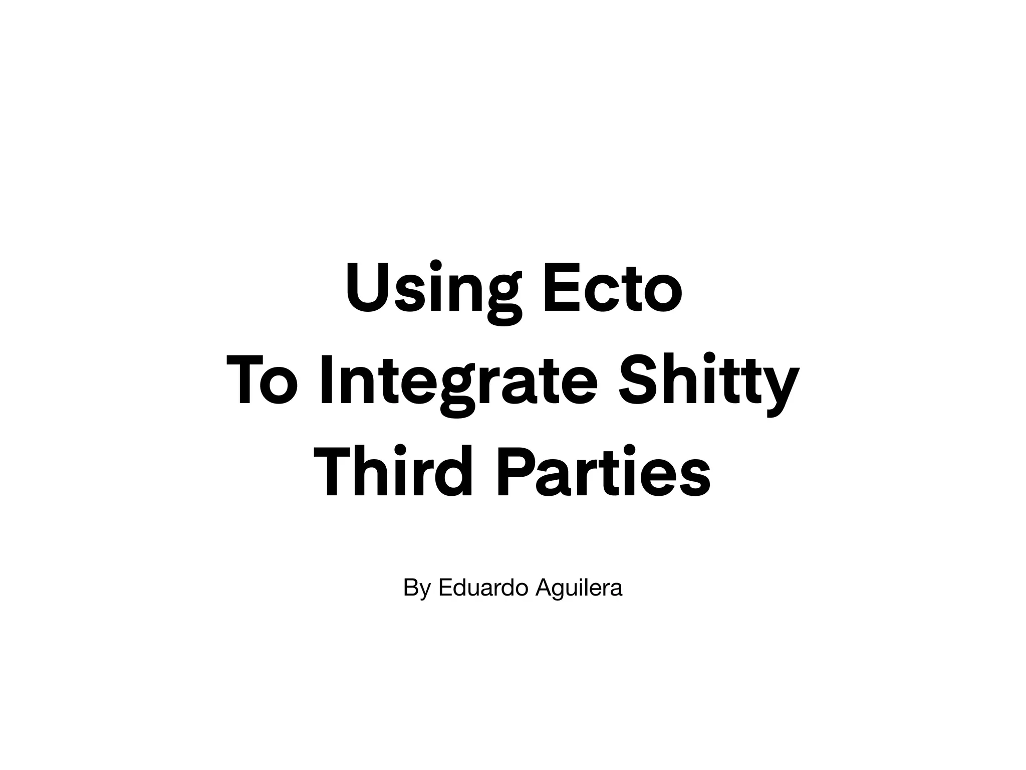 This document discusses using Ecto to integrate with third party services. It describes Ecto's main components like Repo, Schema, Changeset and Query for working with data. It focuses on how Ecto Changesets provide validation of data from external sources before applying changes. The document also notes challenges with integrating a "shitty" third party service that provides no feedback on requests. It provides examples of using Ecto Changesets to validate data of any Ecto type, with or without a database table.