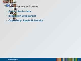 The document discusses integrating the Jadu content management system (CMS) with SunGard's Banner student information system. It describes how Jadu implements the integration through widgets and APIs that allow accessing Banner data. It also presents a case study of the University of Leeds, which developed a course catalog module and mobile app using Jadu and Banner data to provide students with course information.