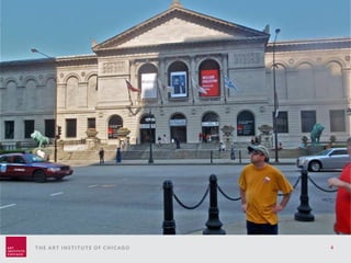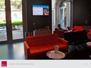 The document summarizes the Art Institute of Chicago's efforts to integrate broadcast and interactive digital displays to enhance the visitor experience. It provides an overview of their signage portfolio, lessons learned, and future plans. The presentation discusses choosing appropriate communication modes and content based on objectives, and considering software, hardware, infrastructure, and budgets required for implementation. It aims to help visitors discover the collection and inspire them through new digital signage and interactive technologies.