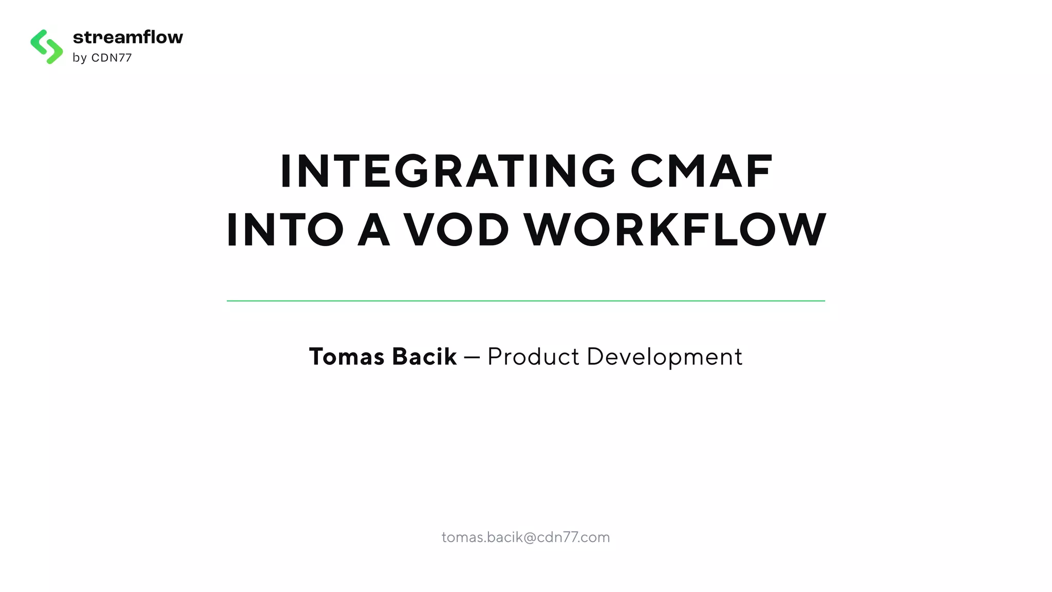 The document discusses the integration of Common Media Application Format (CMAF) into Video on Demand (VOD) workflows, highlighting its benefits such as improved storage efficiency, caching performance, and low latency live streaming capabilities. It outlines the technical specifications, compatibility issues with legacy devices, and the support of various DRM schemes. The document concludes with a focus on the future of CMAF and its potential in fostering industry cooperation.