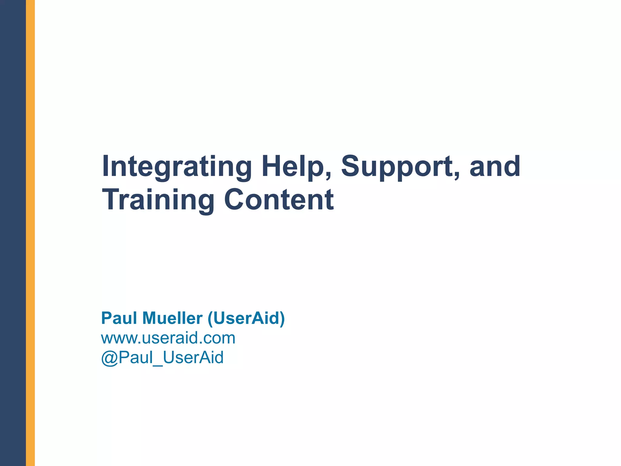 The document discusses integrating help, support, and training content using WordPress. It notes that users want a single place to find answers and integrating content reduces duplicate effort. WordPress was chosen because it is flexible, easy to use, and allows customizing content display through themes and plugins. An example integration at smartvault.com/support is reviewed, showing how WordPress brings together help topics, guides, training videos, a knowledge base, and support policies and contact information into a unified support center.