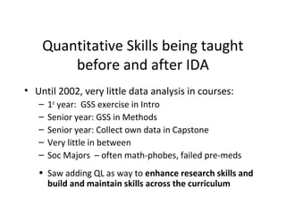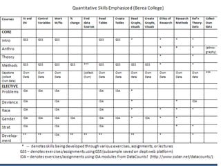 The document summarizes Berea College's efforts to integrate data analysis skills across its social science curriculum. It discusses using ready-made modules from an online data resource to teach skills like reading frequencies, interpreting bivariate tables, testing hypotheses using data, and writing conclusions. Students work through a module comparing earnings by sex and race in class and as homework. They then present their findings and get peer feedback on a written analysis. Pre/post-tests and paper assessments show significant gains in students' quantitative skills and confidence working with data to tell "stories" about social issues.