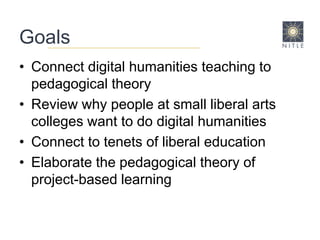This document discusses integrating digital humanities projects into the undergraduate liberal arts curriculum. It connects digital humanities work to pedagogical theory and the goals of liberal education. Specifically, it promotes digital humanities for allowing undergraduate research, preparing students for a networked world, enabling interdisciplinary collaboration, and revitalizing the humanities. The document advocates for project-based learning and references high-impact educational practices like undergraduate research, collaborative assignments, and capstone projects that can incorporate digital methodologies.