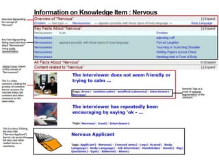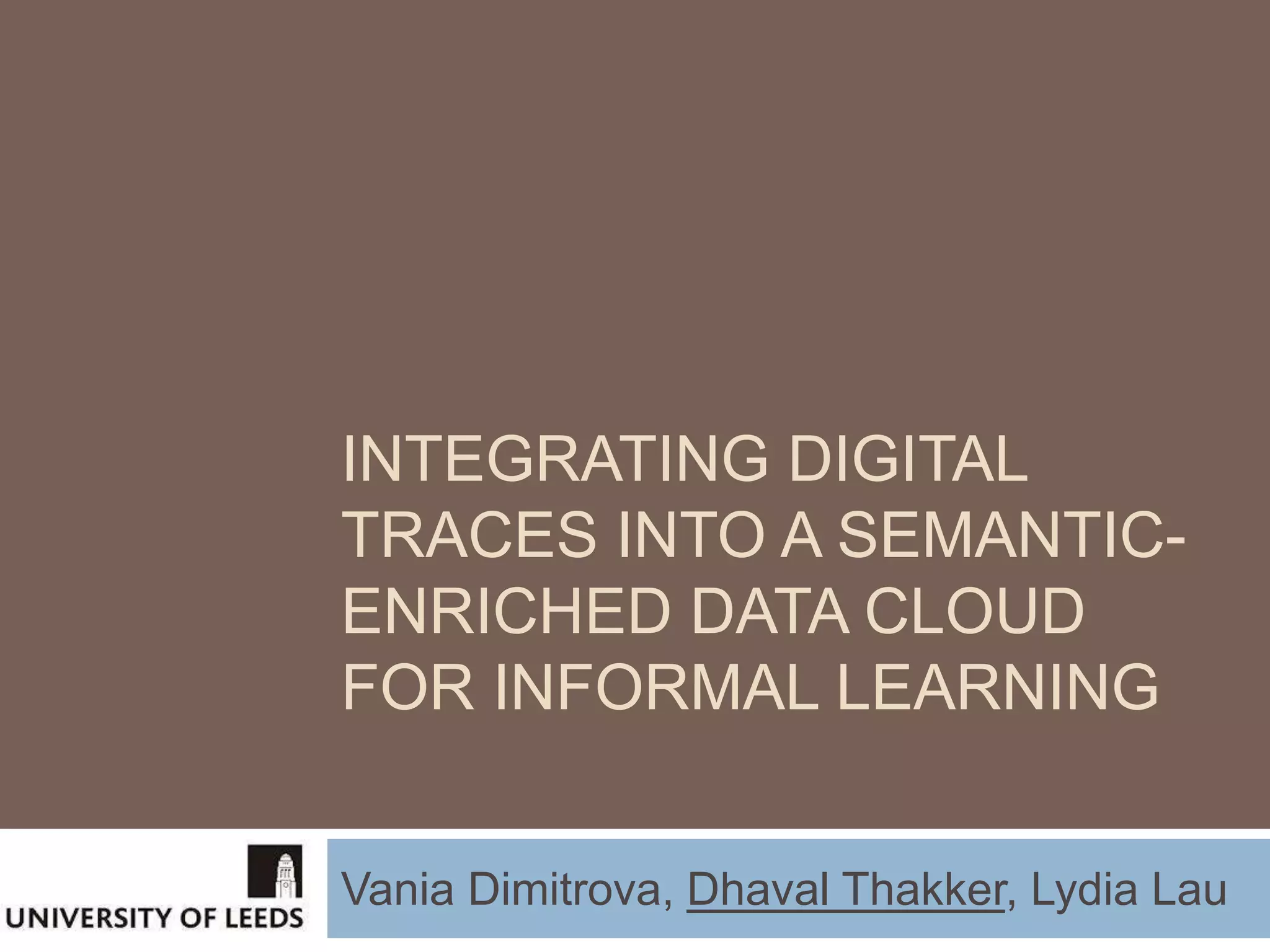 The document discusses integrating digital traces from social media into a semantic-enriched data cloud for informal learning. It outlines a processing pipeline that collects digital traces, semantically augments them using ontologies, and allows browsing and interaction through a semantic query service. An exploratory study on job interviews found that authentic examples from digital traces were useful learning stimuli but could be mistaken as norms without context. Semantic technologies provide opportunities to organize digital traces for informal learning but further work is needed to fully realize this potential.
