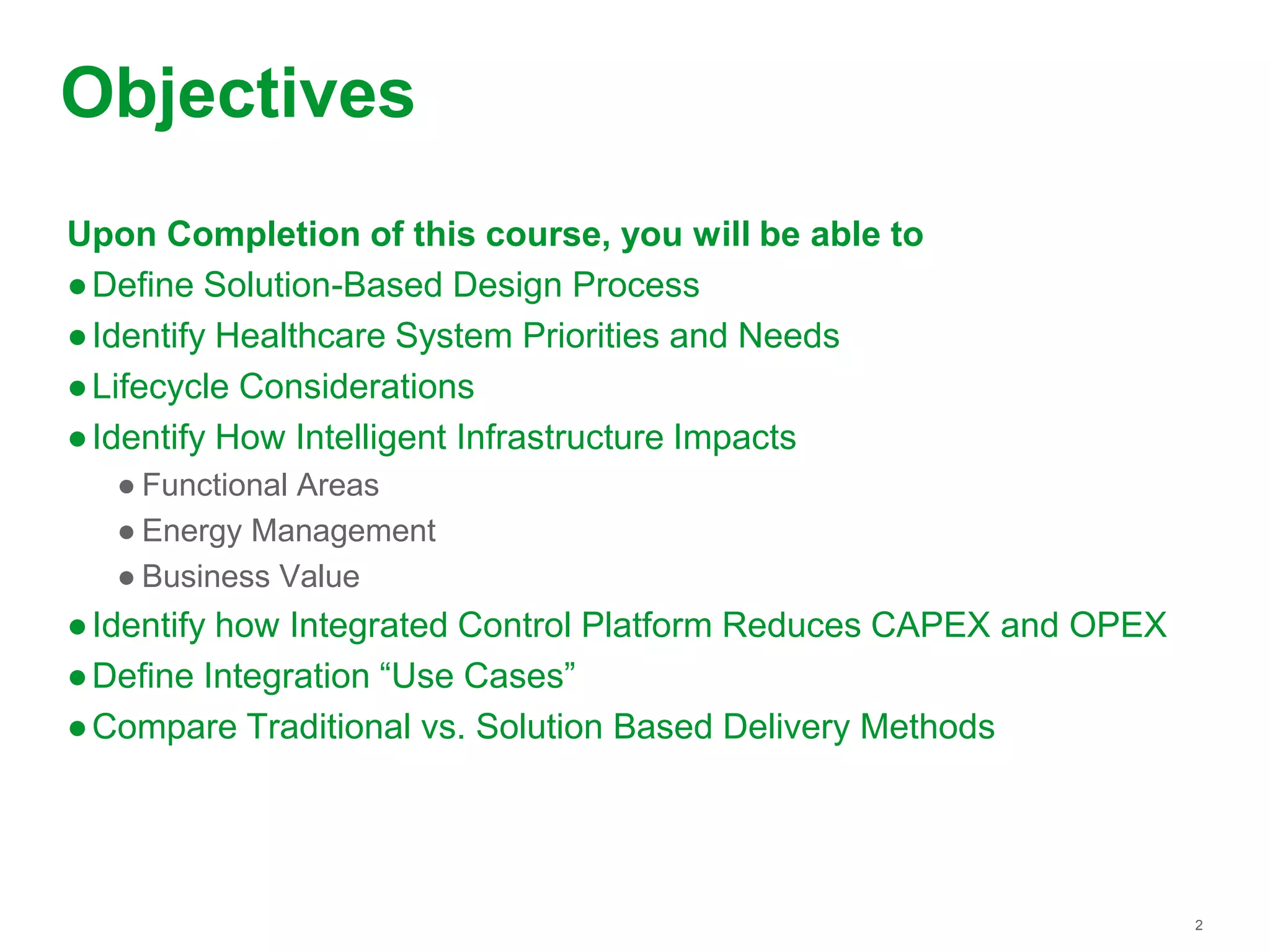 The document outlines a course on integrating efficiency into healthcare through a life cycle approach, emphasizing solution-based design processes and the importance of intelligent infrastructure. It identifies healthcare priorities like improving financial performance, safety, and patient satisfaction while comparing traditional and solution-based delivery methods. Additionally, it discusses energy management, use cases, and cost-effective contracting methodologies for integrated systems to achieve better outcomes in healthcare facilities.