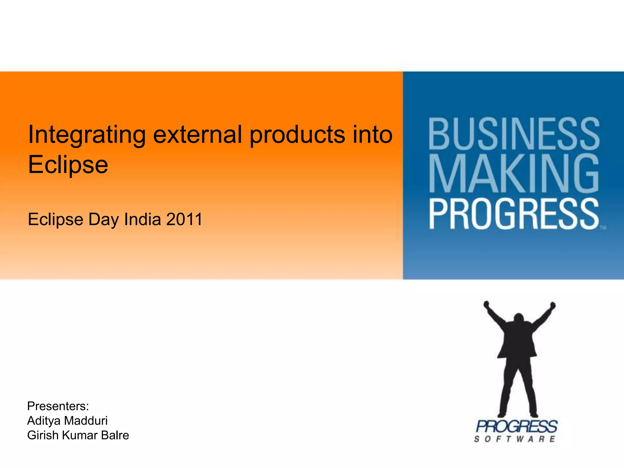 This document discusses integrating external products built using different technologies into the Eclipse IDE. It covers the need for integration, challenges in integration like communication between technologies and attaching to the Eclipse UI. Integration points in Eclipse like editors, views, menus and preferences are described. Examples provided include integrating a web application, Win32 application, and Swing application into Eclipse. The key is to leverage Eclipse facilities, address challenges through techniques like inter-process communication, and make optimal use of Eclipse's usability.