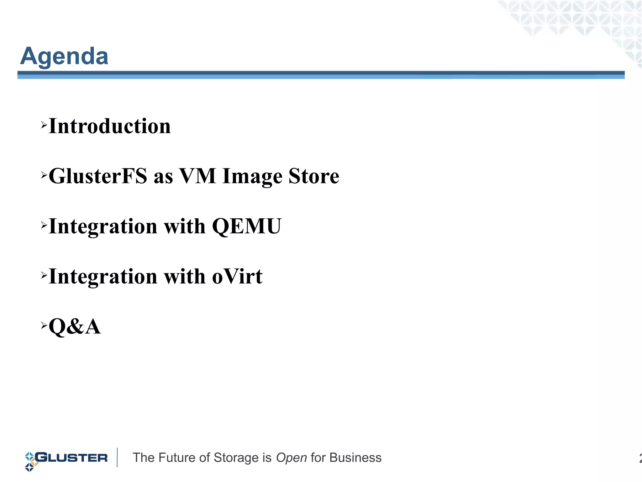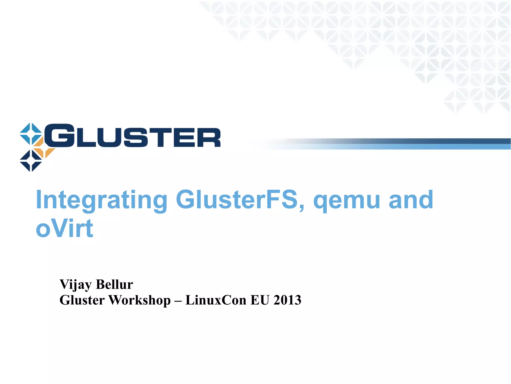 This document discusses integrating the open-source GlusterFS distributed file system with QEMU virtualization and the oVirt virtualization management platform. It provides an overview of GlusterFS and how it can be used as virtual machine image storage. It then describes integrating GlusterFS with QEMU either directly or through NFS, as well as new features in oVirt 3.1 for managing GlusterFS volumes from within oVirt. Upcoming integrations between oVirt and GlusterFS are also outlined.
