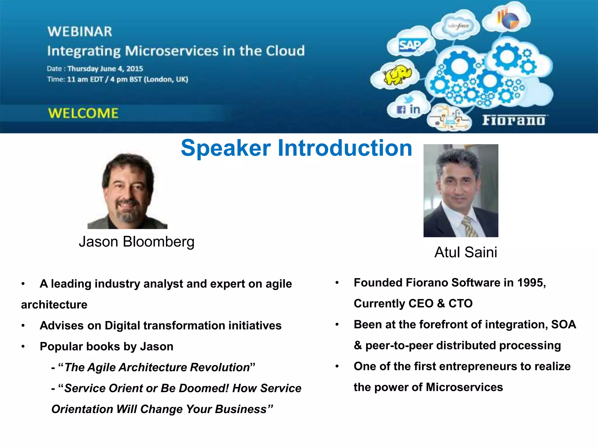This document summarizes a presentation by Jason Bloomberg on integrating microservices in the cloud. Jason Bloomberg is the president of Intellyx and advises companies on digital transformation initiatives. The presentation discusses what microservices are, how to design them for qualities like granularity, parsimony and cohesion. It also covers challenges of integrating microservices in the cloud, including managing state across ephemeral instances and asynchronous interactions.