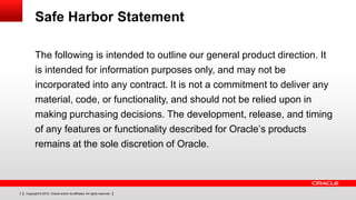 This document discusses Oracle's strategy around integrating existing on-premise applications with Oracle Cloud services. It notes that most large enterprises have a hybrid environment with both public and private cloud deployments and that full integration between on-premise and cloud systems is still incomplete for many. Oracle aims to provide complete solutions and choice by allowing customers to choose their level of control, visibility and adoption speed between private, public and hybrid cloud options. Examples are given of customers like Herbalife who use both Oracle private and public cloud and of integration patterns between Oracle Fusion applications, cloud services and existing on-premise applications.