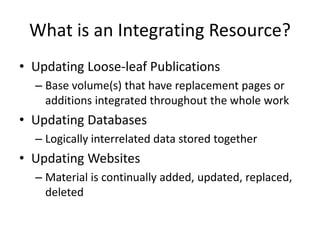 The document discusses integrating resources, including updating various types such as loose-leaf publications, databases, and websites. It outlines guidelines for creating and maintaining records for these resources, highlighting the importance of updating transcribed fields and access points with each iteration. The document also specifies how to manage changes in titles, editions, and physical descriptions in accordance with RDA standards.