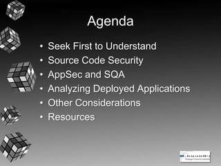 The document provides an overview of integrating security into the application development process. It discusses seeking to understand development methodologies, programming languages, and risk frameworks. It also covers source code security best practices like code reviews and tools. Application security and software quality assurance testing methods are reviewed. The document also discusses analyzing deployed applications and other considerations like training and metrics. Resources for further learning are provided.