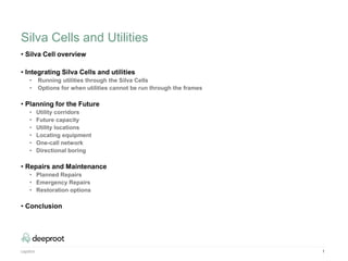 The document outlines the integration of silva cells, a modular shoring system that supports pavements and promotes tree growth, with utilities in urban environments. It discusses various methods for running utilities through silva cells, alternatives when utilities cannot be accommodated, and protocols for future installations, repairs, and maintenance. The conclusion emphasizes the importance of planning for future utility needs and highlights the flexibility and effectiveness of silva cells in utility integration.