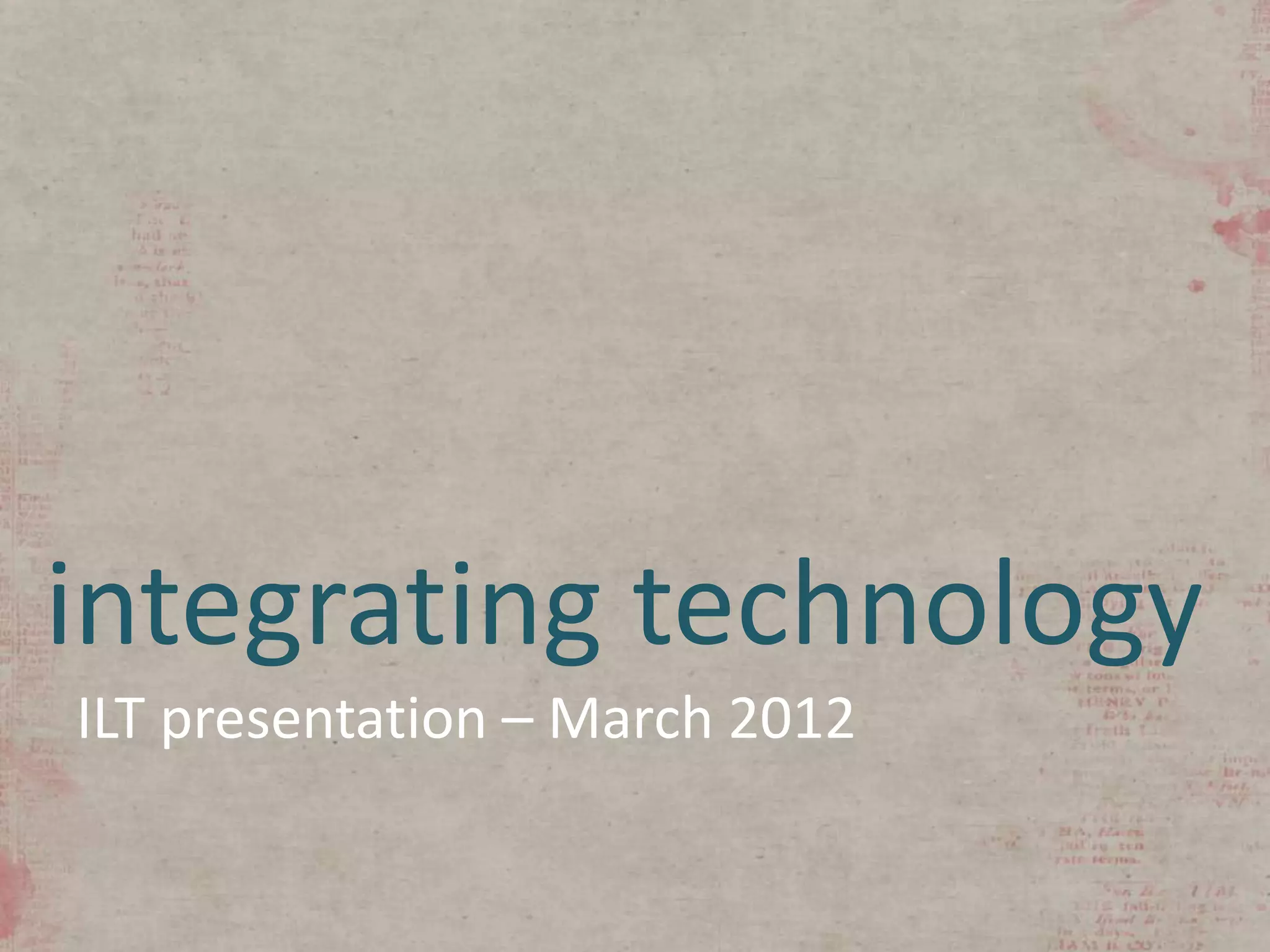 This document provides an overview of integrating technology into education through a presentation from March 2012. It highlights the vast potential for technology integration and discusses how to manage it effectively in the classroom. Resources are shared for finding ideas on curriculum integration as well as open educational resources. Websites for teachers, blogs, and formative assessment tools are also listed. The presentation encourages exploring these resources to bring technology into education.