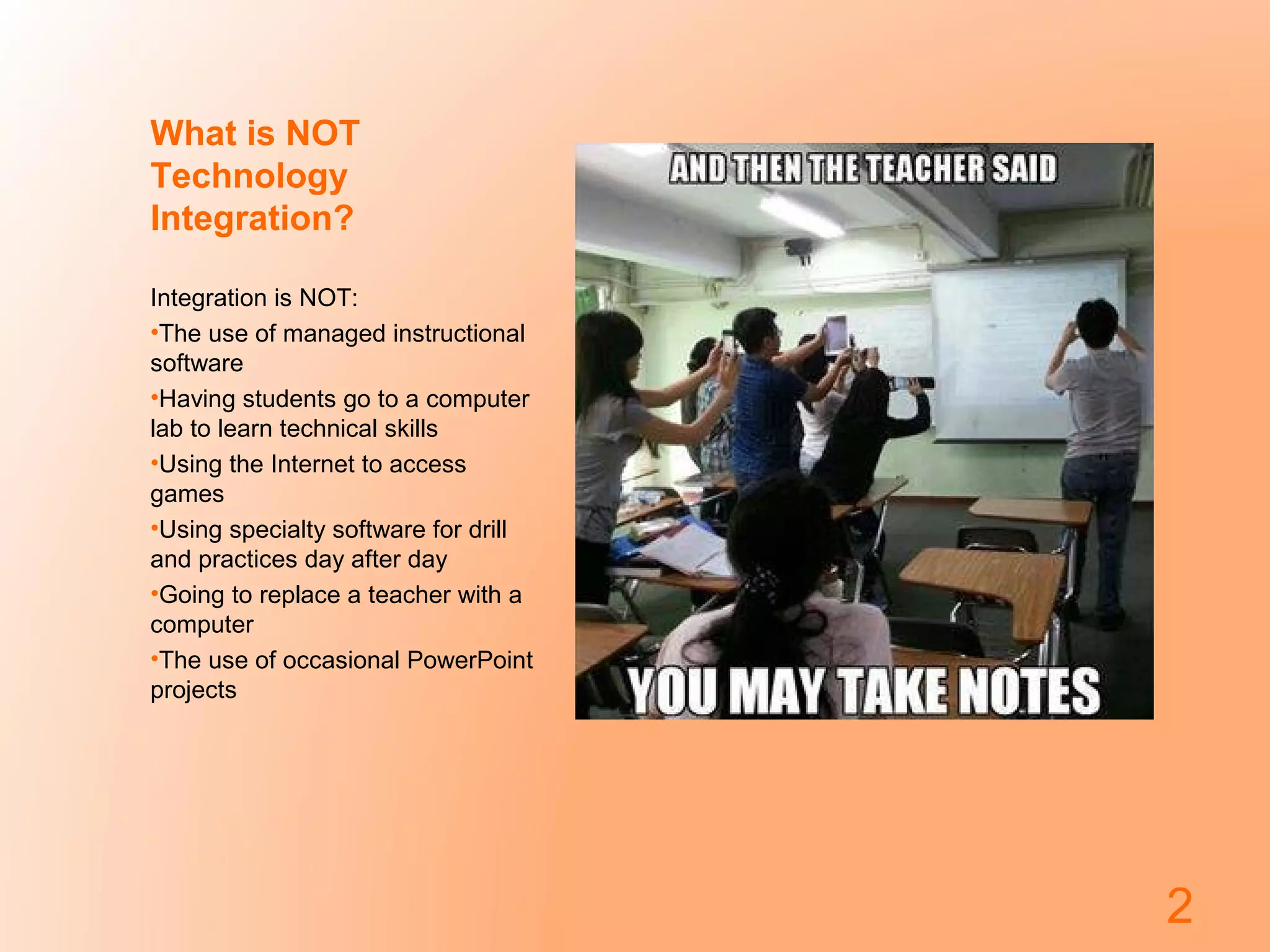 The document discusses technology integration in education. It defines technology integration as using technology to introduce, reinforce, extend, enrich, assess, and remediate curricular goals. This involves collaboration and planning by educators and always includes their participation. Some examples of what is not considered technology integration are using software just for drills, having students learn technical skills in a computer lab, or replacing teachers with computers. The document encourages technology integration because it can help teach students skills like complex thinking, problem solving, and collaboration. It provides tips for successful integration, such as starting small, embracing experimentation, and having backup plans for when problems occur.