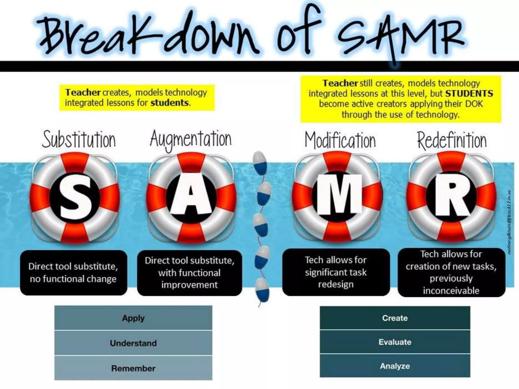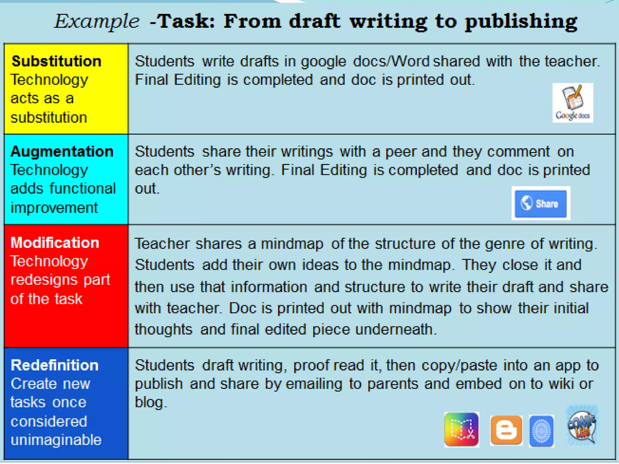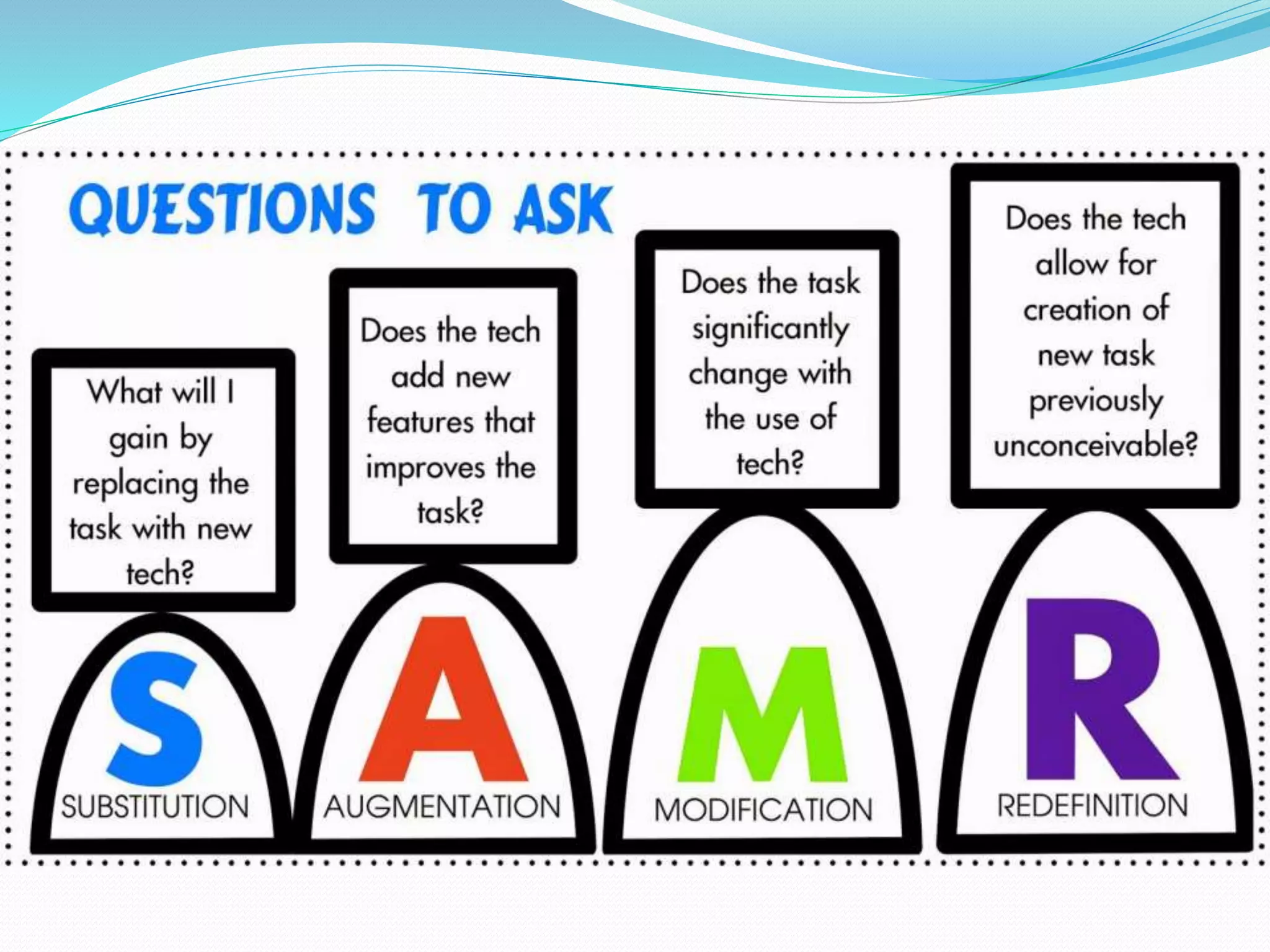 The document discusses integrating technology into teaching using the SAMR model, which categorizes the use of technology into four levels from substitution to redefinition. It provides examples of classroom activities that fall under each level of SAMR and encourages teachers to be creative in using technology as a tool to enhance what students are learning. Workshops are also proposed to help teachers classify technology uses based on the SAMR model.