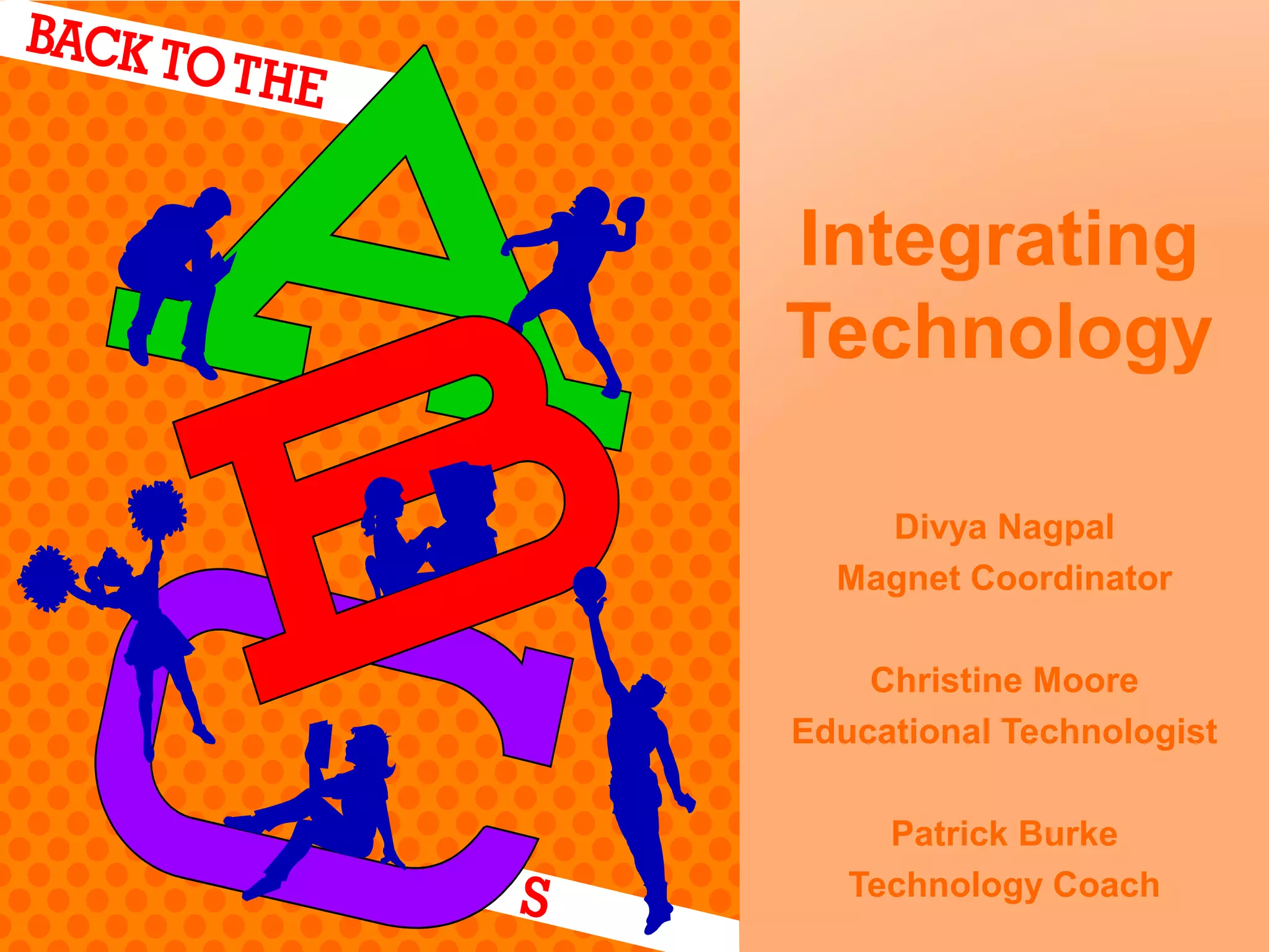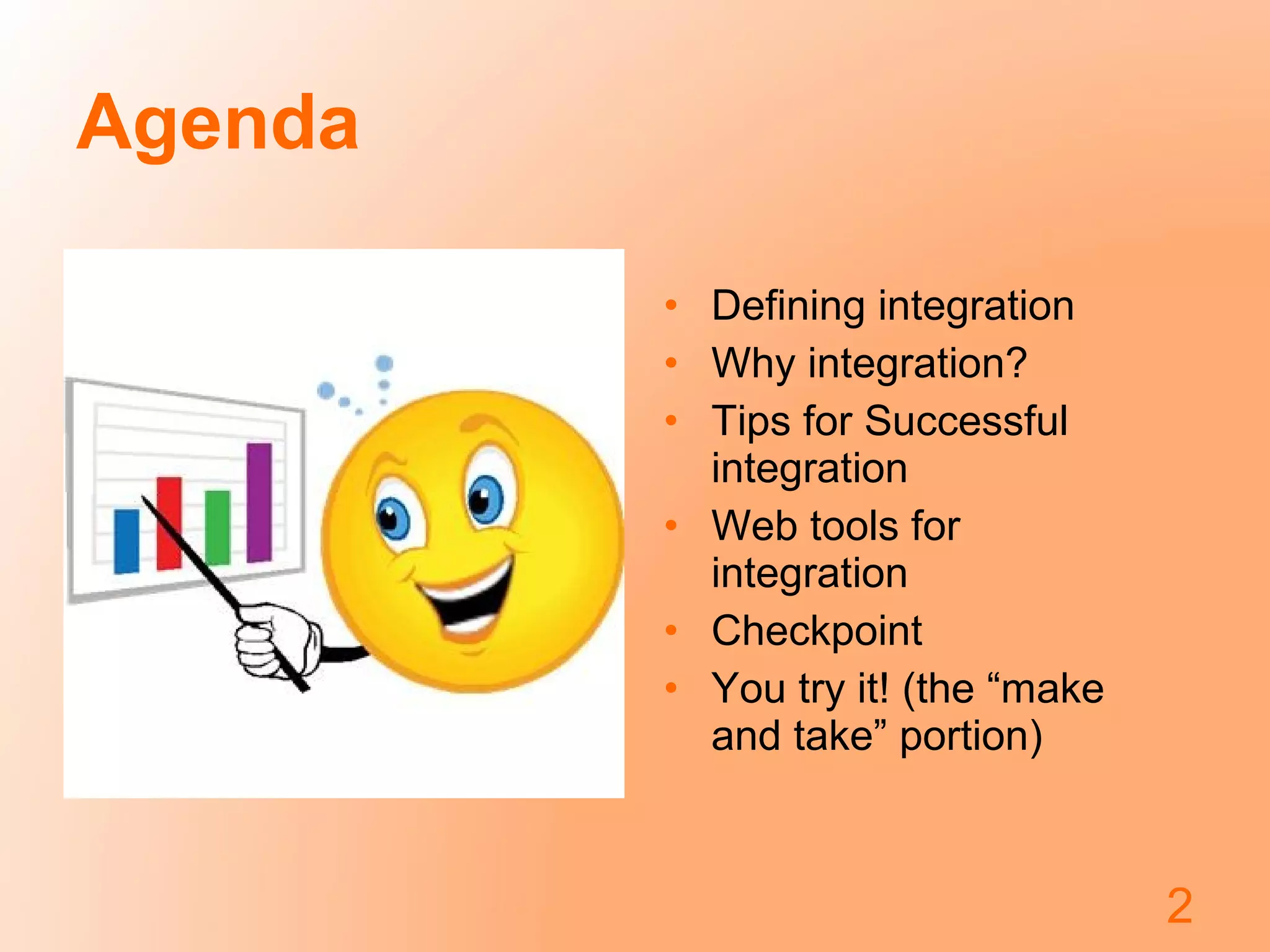 This document provides an overview of technology integration for educators. It begins by defining integration as using technology to introduce, reinforce, extend, enrich, assess and remediate curricular goals, with collaboration and planning. Examples are given of what is and is not integration. The benefits of integration include encouraging complex thinking and problem solving. Tips for successful integration include having administrative support, educator buy-in, training, and experimentation. Web tools that can aid integration are presented, with a wiki being created for participants to interact and share resources and ideas.