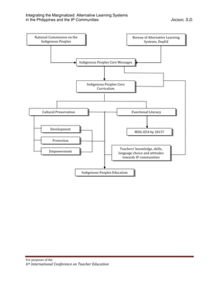 This document discusses improving education for Indigenous Peoples communities in the Philippines by focusing on teachers' knowledge and skills, use of language, attitudes, developing an Indigenous Peoples core curriculum and messages, and working with government organizations like the National Commission on Indigenous Peoples and Bureau of Alternative Learning Systems.