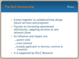 The document discusses the integration of unique materials into the global discovery network through the RLG Partnership, which involves approximately 130 diverse institutions collaboratively designing future library services. It emphasizes the need for libraries to adapt their services to user workflows, addressing hidden collections, optimizing metadata, and improving access to special collections and archives. Additionally, it outlines challenges like rights management, the digitization of materials, and the importance of collaboration among institutions to enhance discovery and preservation efforts.