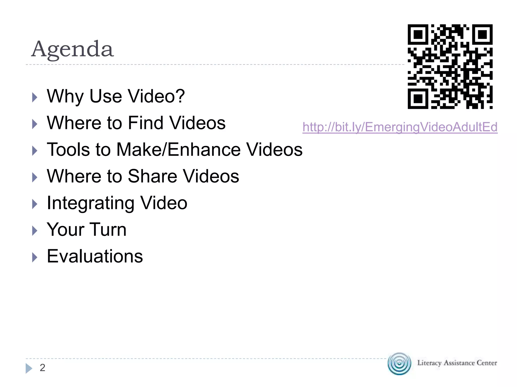 The document outlines the integration of video in adult education, discussing the benefits and various resources available for finding, creating, and sharing educational videos. It explores platforms like YouTube, Teacher Tube, and Vimeo, alongside tools for video creation such as Zaption, Voicethread, and WeVideo. Additionally, it provides insights into the impact of video on learning and links to further resources and evaluations.