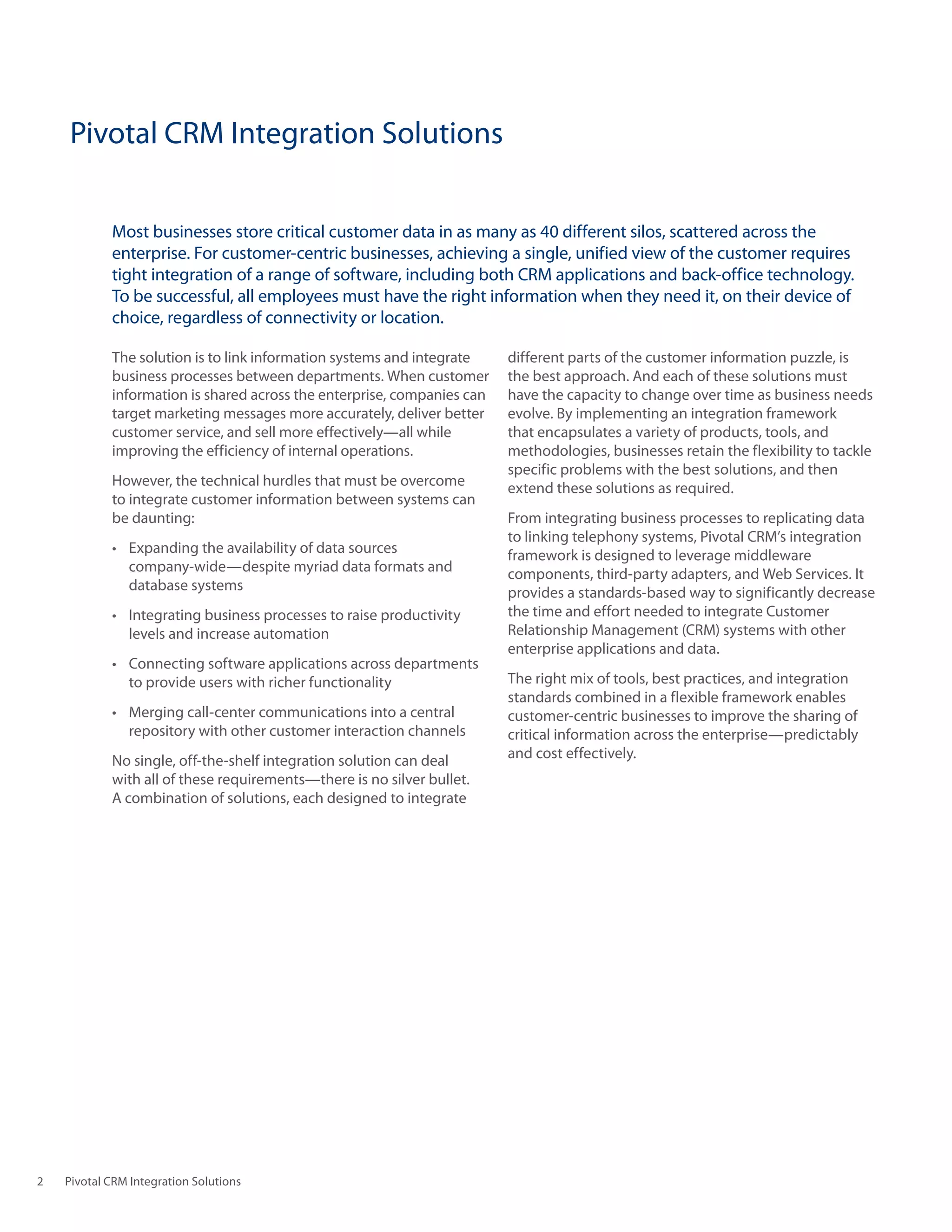 Pivotal CRM integration solutions address the challenge of managing customer data stored in multiple silos by offering a framework that connects CRM systems with various enterprise applications. This enables organizations to maintain a unified view of their customers and enhance operational efficiency through seamless integration, regardless of location or device. The solutions utilize methodologies like enterprise application integration and web services, allowing businesses to adapt as their requirements evolve.