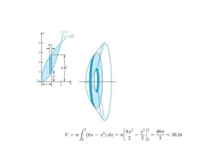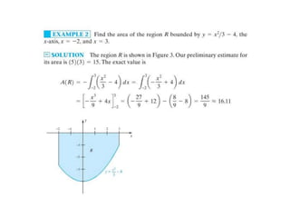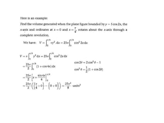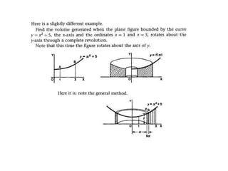 The document discusses the calculation of areas under curves using integrals, including both basic applications and examples of finding areas between curves. It also covers the volumes of solids of revolution using the methods of disks and washers, alongside examples for each method. Additionally, the document touches on applications of integrals in fields such as science and population growth.