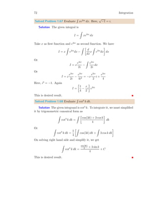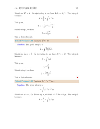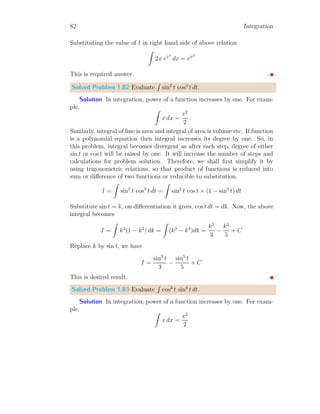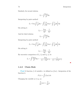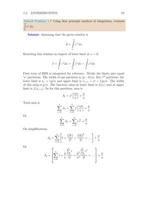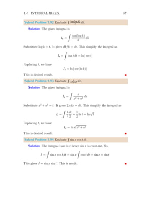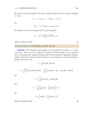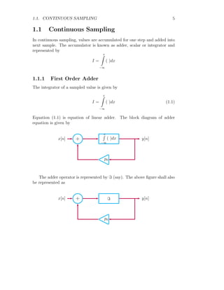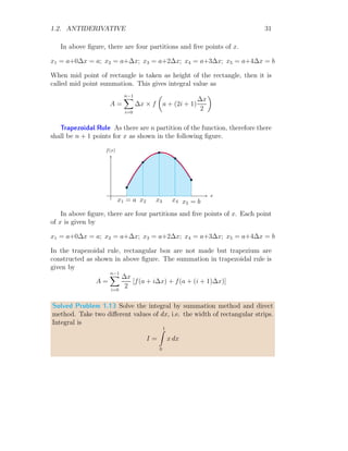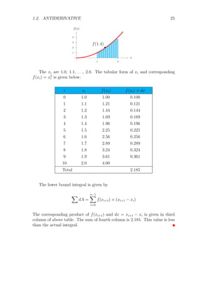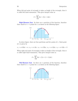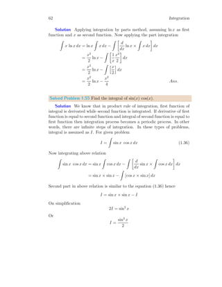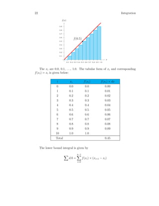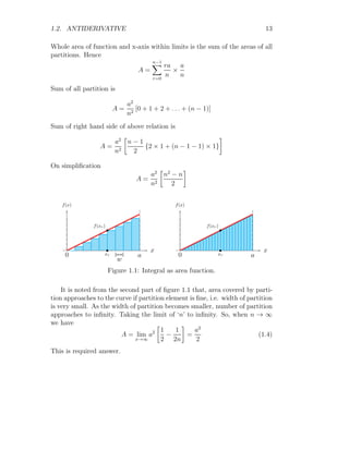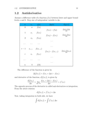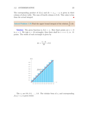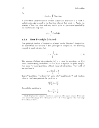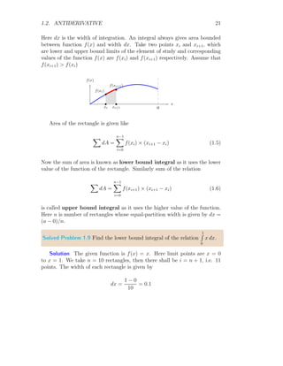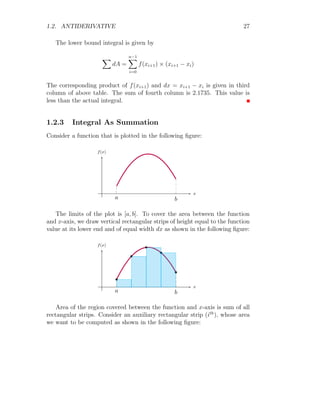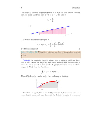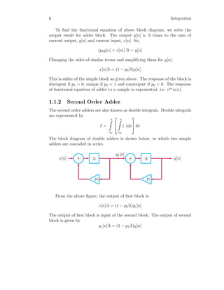 The document provides a comprehensive overview of integration, defining it as the reverse process of differentiation, also known as the anti-derivative, which increases dimensionality and provides calculated areas and volumes. It discusses concepts such as continuous sampling, first and second order adders, integral rules, and antiderivatives, conveying mathematical principles and properties of integrals. The document also addresses practical examples and problem-solving strategies related to integration techniques.