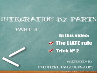 The document discusses the LIATE rule for integration by parts. LIATE is an acronym that indicates the order of priority for choosing the u(x) function: logarithmic, inverse trigonometric, algebraic, trigonometric, exponential. Two examples are provided to illustrate applying the LIATE rule. In the first example, choosing u(x)=x for x sin x dx works according to LIATE. In the second example, choosing u(x)=sin x for ex sin x dx works according to LIATE after solving using integration by parts twice.
