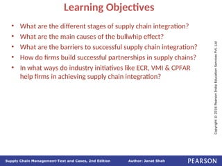 The document discusses supply chain integration, emphasizing the stages involved, causes of the bullwhip effect, and barriers to successful collaboration among firms. It outlines strategies for improving integration and mitigating demand distortions, such as sharing information and aligning incentives. Successful relationships in supply chains are highlighted as essential for achieving operational efficiencies and overcoming external coordination challenges.