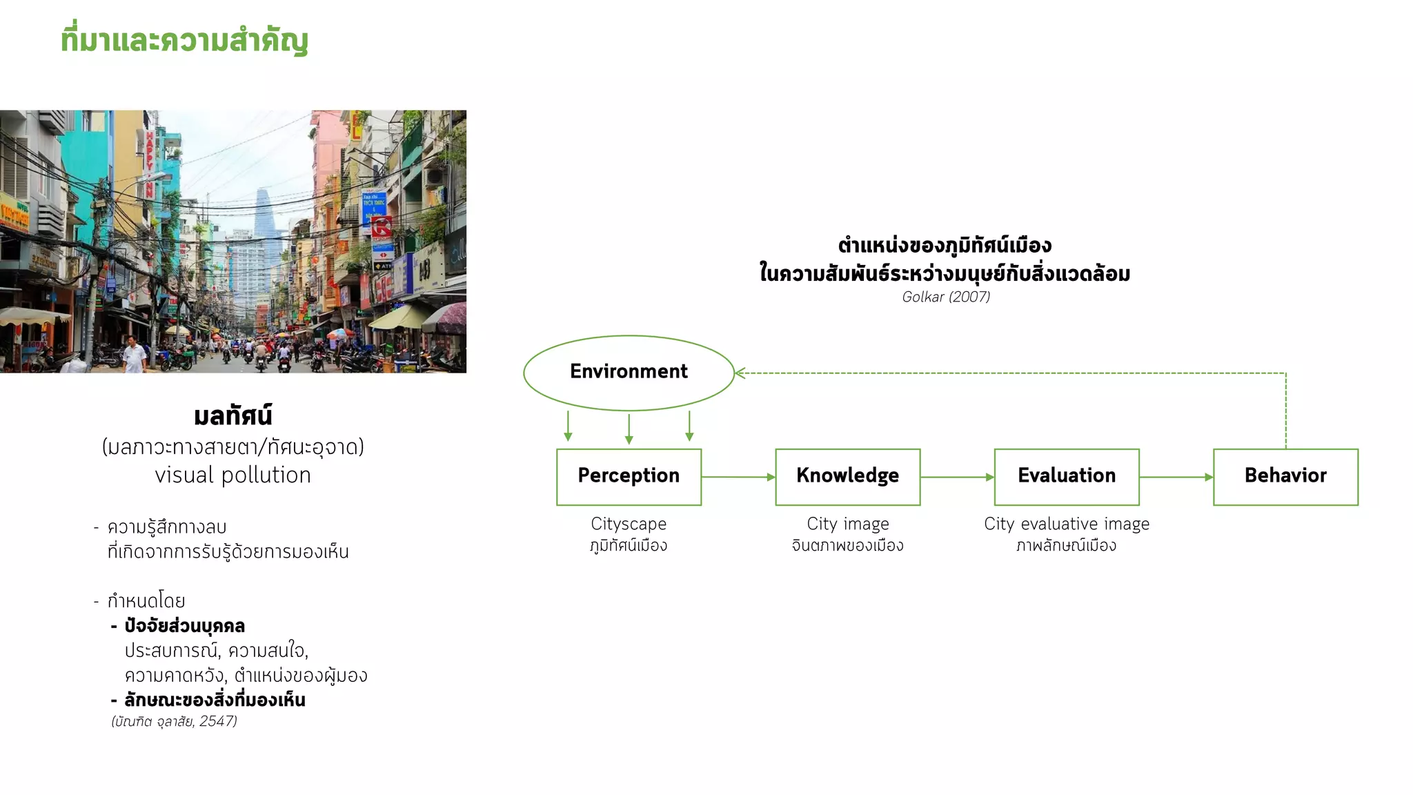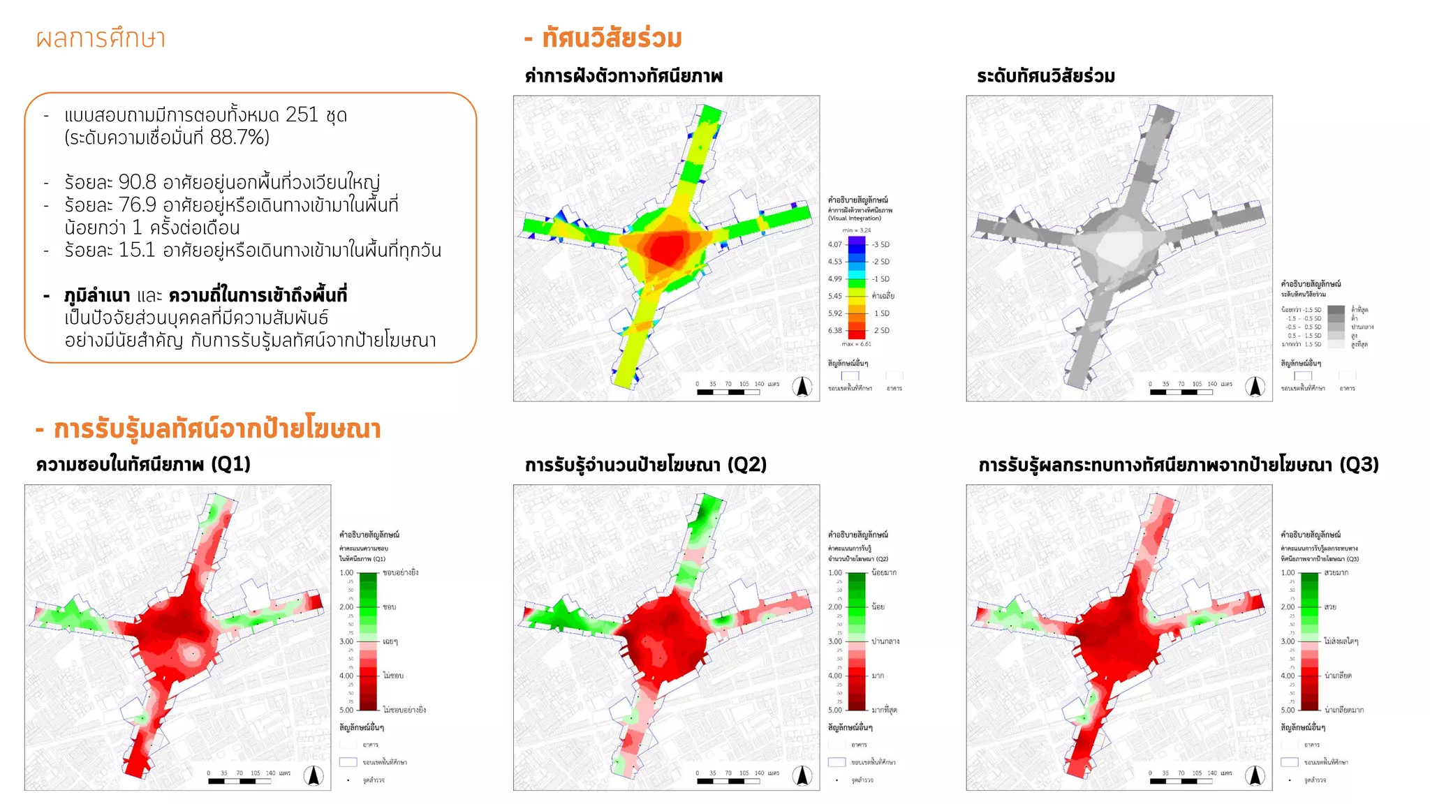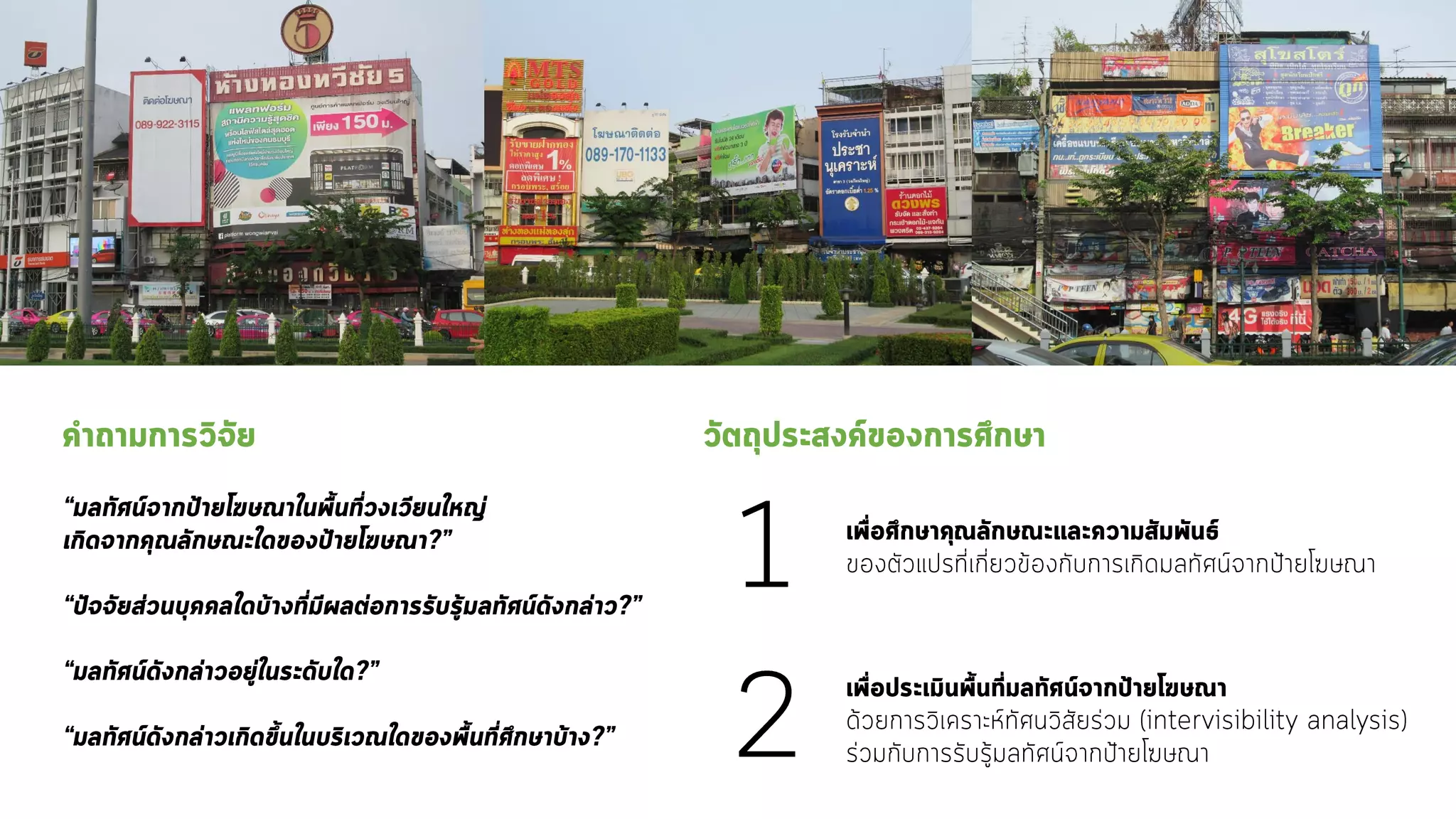 Bangkok has planned to improve the cityscape of Wongwian Yai area due to existing outdoor advertisements (OAs) which reportedly contribute to visual pollution. This study thus aims to evaluate: (1) which OA attributes contribute to visual pollution, (2) which personal factors affect perception of visual pollution, and (3) to what extent visual pollution occurs in certain areas. The evaluation integrates Intervisibility Analysis which uses Space Syntax technique to predict accessibility and Perception Assessment which encompasses personal factors and OA attributes. Questionnaires are collected at the designated points located every 50 meters for spatial interpolation. Inferential statistical analyses are also conducted. 4 out of 8 OA attributes significantly contribute to visual pollution: (1) material/texture, (2) size/proportion, (3) altitude, and (4) content. Origin and frequency of access are personal factors significantly correlated with perception of visual pollution caused by OAs. Therefore, urban planning measures should be enacted to regulate the OA attributes, according to intervisibility level of certain areas.