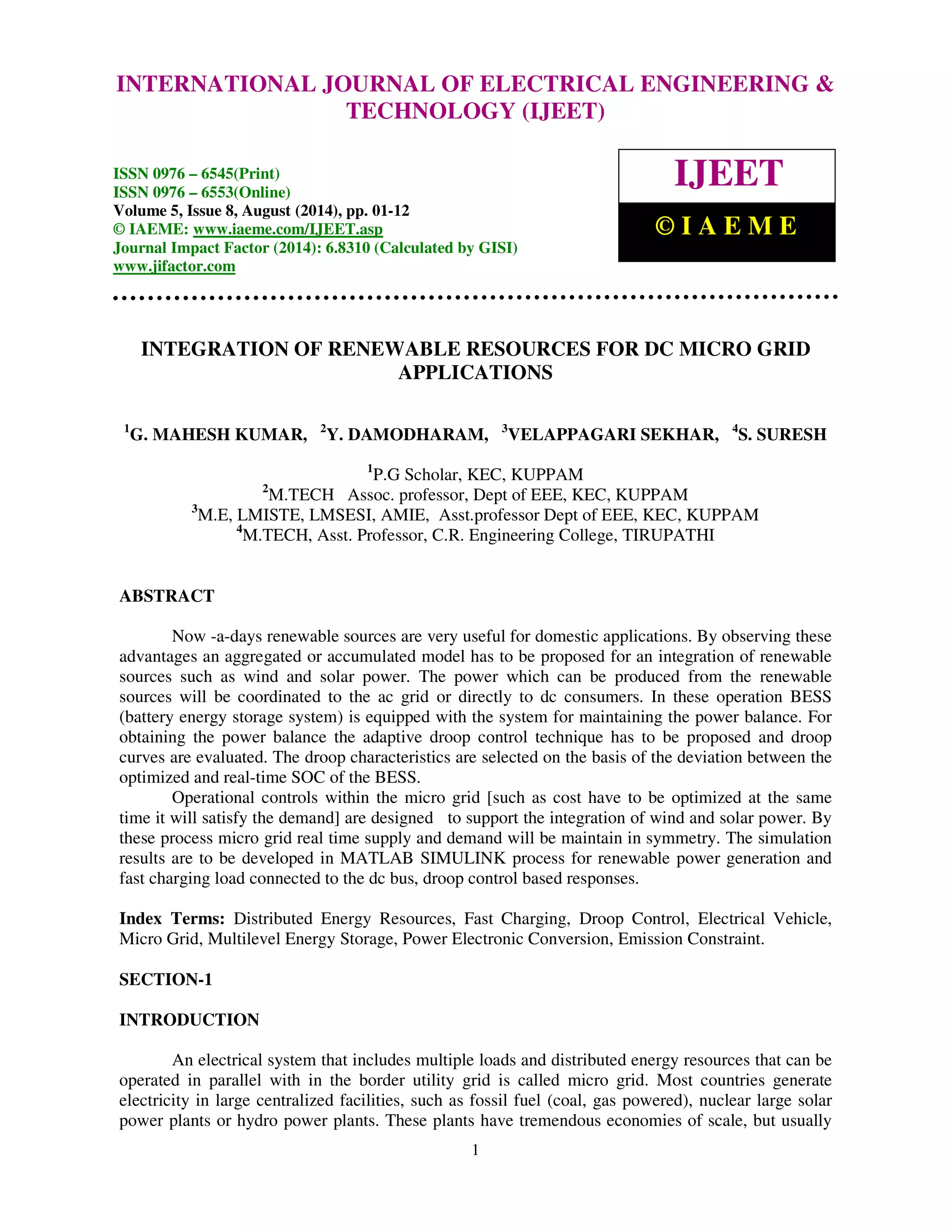 This document summarizes a research paper that proposes integrating renewable energy resources like wind and solar power for DC microgrid applications.